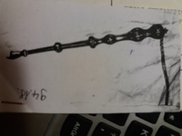 Elefántcsont és fa. Esztergált , faragott. Prefilált, kerek talp, csavart, gyűrűidomokkal tagolt szár, tetején elefántcsont jobbkéz tart egy hengeren álló prefilált félgömbös csúcsot. Talpán ráégetett héber felirat: Misna Egylet embereinek ajándéka, Krivej Reg"