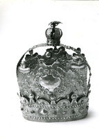 Ezüst, püspöksüveg alakú. Alsó ovális abroncsán két sor trébelt gyöngysor utánzat között trébelt ékkő idomok és színes kövek. Ebből emelkedik ki két hajlított nagy lap, ezek alkotják a koronát. Ennek pereme karélyos, alapja poncolt. Két oldalán tartóban virág. Közepében koszorúban medallion, melyben héber vésett felirat. A két lap között hajlított széles abroncson trébelt virág és levél díszek. Az abroncs közepén öt abroncsú kis korona. Ebben csengő. Felette plasztikus virágcsokor.