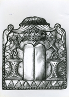 Aranyozott vörösréz. Oltáridomú. Vésett leveles és rozetás kerettel szegett mezőben gazdag filigrános indadísz. Közepén levő tagozat frigyszekrény idomú. Oldalán és két ajtaján zöld és kék zománcos levél ékítményekkel. Fülkéjében filigránműves tóratekercs. Tetején nyolcabroncsos áttörtművű korona, belsejében két csengővel. -