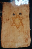 Fehér ripsz, sárga selyemfonállal hímzett. Közepén Dávid-csillag, efölött királyi korona, alatta két héber betű: