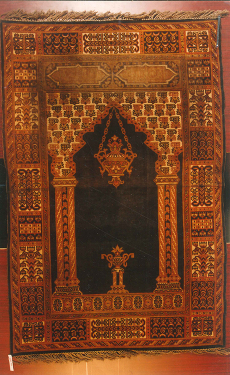 Gyári perzsaszőnyeg jellegzetes mintával, az ima irányát jelző dísszel. -