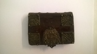 Részben aranyozott ezüst. Felül baldachinos, pajzs alakú. Alul díszes keretben felirat. Oldalán két-két oszlop, a szélső oszlopokon oroszlánok állnak, a belső oszlopokon támasztott 2 db brokály formájú címer pajzs domborított felületén héber felirat. Közöttük applikált korona, középen makkban végződő virág és levél vonulat között felül köríves, szögletes bemélyedés. Felül harang alakon kétfejű, stilizált madár. Trébelt, poncolt rátett díszítések.Hátul lánc, széles kivitelben.