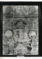 The Shiviti plaques are placed above the podium from which the prayer service is lead in a way that the hazzan (cantor) faces the plaque when facing east during prayer. These plaques received their name from the Biblical verse inscribed on them. Verse 8 of Psalm 16 says: Shiviti Adonay le-negdi tamid, “I have set the Lord always before me”. Shiviti plaques are usually elaborately decorated. Its decoration had to draw the attention of the cantor to Jewish values, and thus help him with concentration and immersion in prayer. Micrographic designs are typical elements on Shiviti plaques: the scribe writes holy texts with tiny characters in a way that they depict various abstract patterns, flowers, animals or human figures. The shiviti plaque of Leibrich Leeb made in Austerlitz, however, breaks with the tradition and the human figures appear, and the psalms rendered as decorative elements on the façade of the building. In the upper left medallion, High Priest Aaron is visible, while on the right one Moses with the stone tablets. Among them in a rectangular form one can discern scenes of King David playing on the harp, and Jacob’s dream.