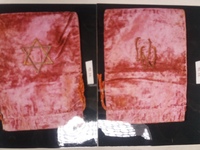 Lila brokát fémszálas díszítéssel. Közepén ovális keretben héber felirat, fölötte korona.