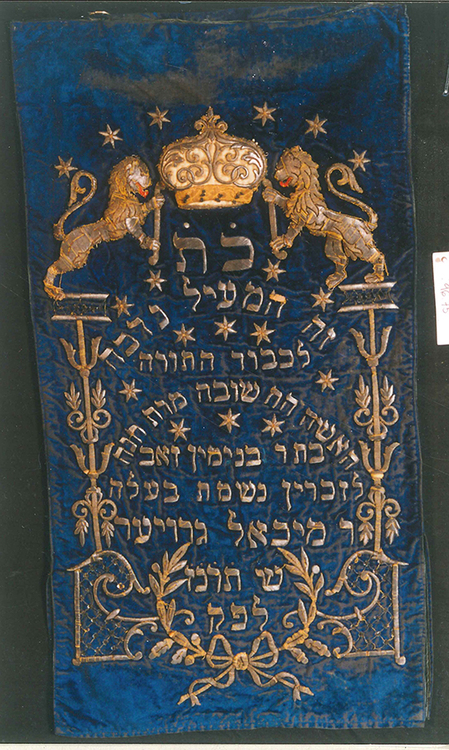 Kék bársony, fémszállal hímzett. Két oldalon oszlop, rajta egy-egy oroszlán, középen koronát tartanak. A két oszlop között héber felirat az adományozó (Grauer Miksáné) nevével, alul koszorú ornamentika, benne az évszám: 5657