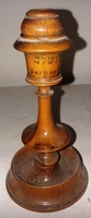 Tagozott esztergált talpa bemélyed, fölötte gyűrűs szár, legfelül a gyertyatartó. A tartó része is tagozott. A tartón felirat: