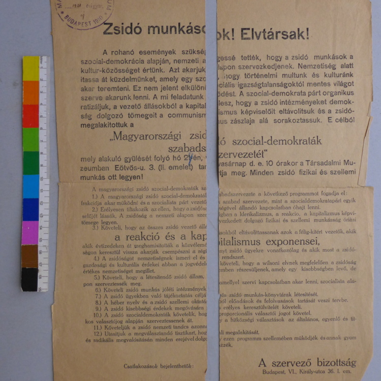 Szervezőbizottság , “Magyarországi zsidó szociáldemokraták szabadszervezetének megalakuló ülésére hívó plakát,” MILEV, accessed February 7, 2026, https://collections.milev.hu/items/show/35783.