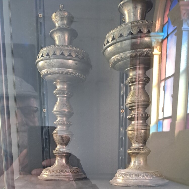 Ezüstözött réz. Préselt, vésett, domborított és fűrészelt díszítéssel .Tagolt, profitált talpán tojássormintás és geometrizáló díszítés. Szára szintén tagolt, nodusa díszváza formájú, fölül levél és virágmotívumokkal díszített, tetején korona.