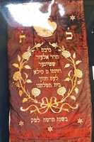 Vörös bársony fémszállal hímezve.Két oldalt oszlop , felette architektúra. Felül korona, körülötte ékkő utánzatok. A korona mellett két betű: